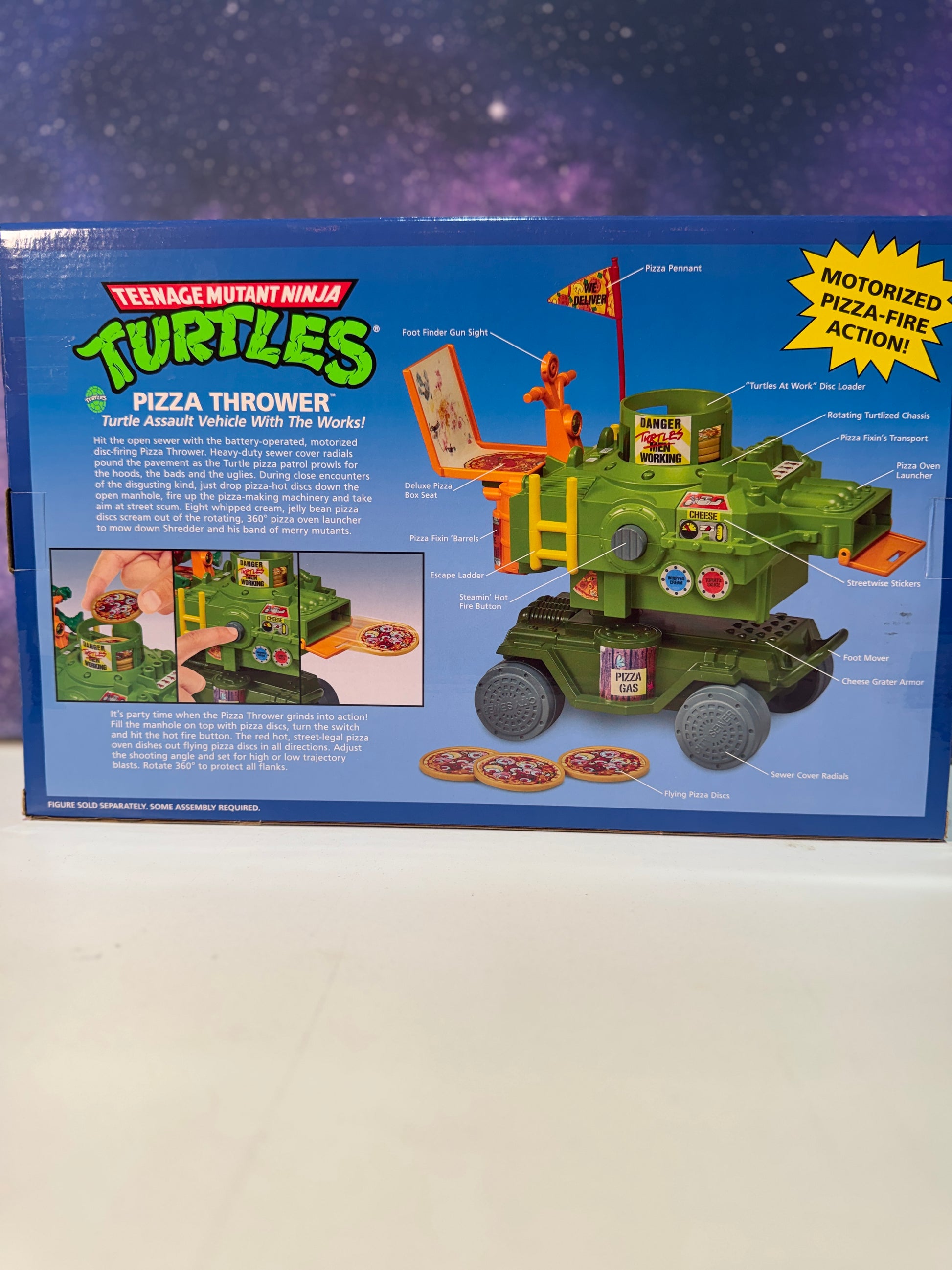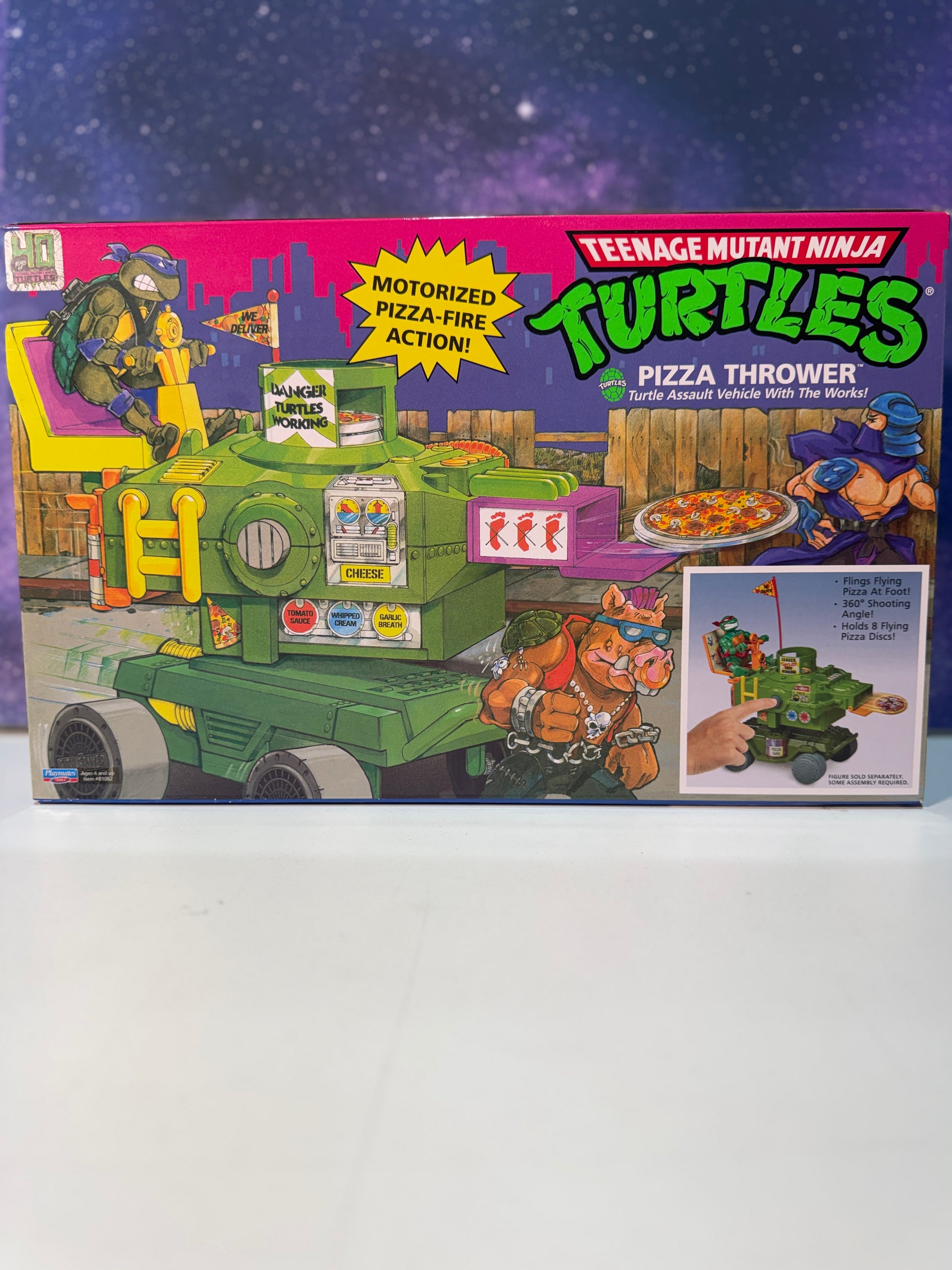 The Teenage Mutant Ninja Turtles Pizza Thrower is a fun and interactive toy inspired by the iconic heroes in a half shell. Designed for fans of all ages, it allows you to launch pizza-shaped discs with precision, mimicking the turtles' favorite snack in action-packed play. Crafted with durable materials, this toy offers engaging entertainment while celebrating the classic TMNT theme. Perfect for collectors and enthusiasts seeking a unique addition to their Teenage Mutant Ninja Turtles memorabilia.